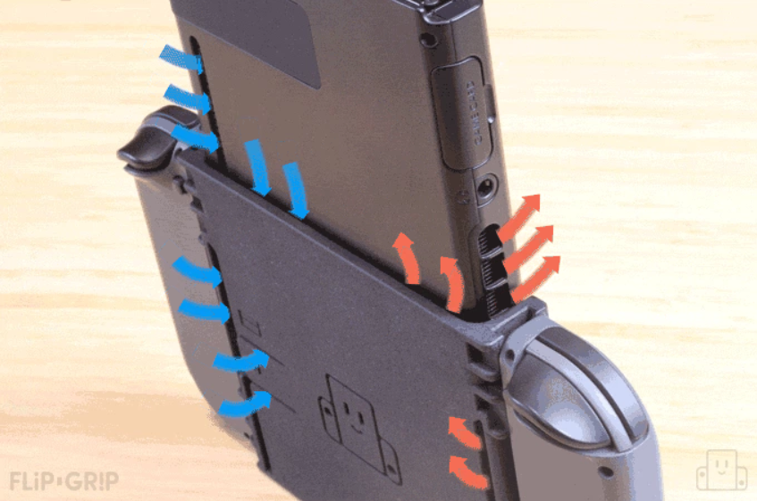 The Flip Grip is designed to only accept the Nintendo Switch in one direction, 90 degrees counterclockwise. The Joy-Cons also slip onto the side of the grip like they would on the normal side railings of the console.