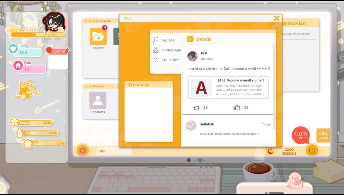 The whole simulation follows someone immersing themselves in the life of a fangirl, creating an oshi they adore, and then developing fan fiction and works ahead of a major comic convention. Along the way, you need to visit places for inspiration for your works, collect items starring the character you love, go through other activities, and interact with fellow creators and fans.