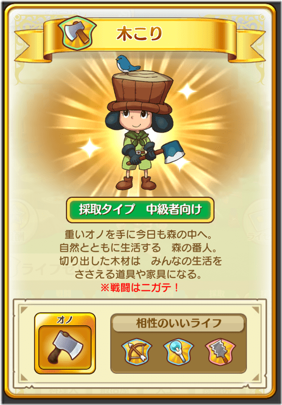 A sword-and-shield wielding Hero who protects the people from evil! It’s a perfectly balanced class with quick combos, and is recommended as a first Life Class for newcomers. 2. Woodcutter
