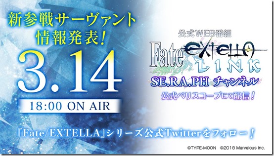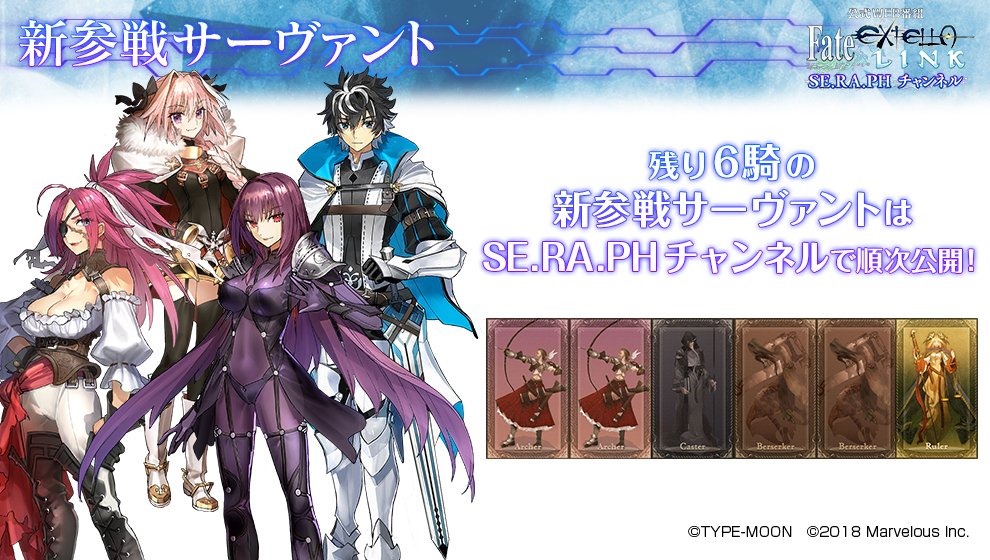 The live stream will be available on Periscope as part of the first “SE.RA.PH Channel” broadcastof four episodes, with each episode set to reveal a new playable Servant. The live stream will take place on March 14 at 6:00pm JST with guest appearances from Rumi Okubo and Charles-kun (CV: Ryohei Kimura). We previously got a hint about the six remaining new playable Servants with info on their classes showing two Archers, a Caster, two Berserkers, and a Ruler.