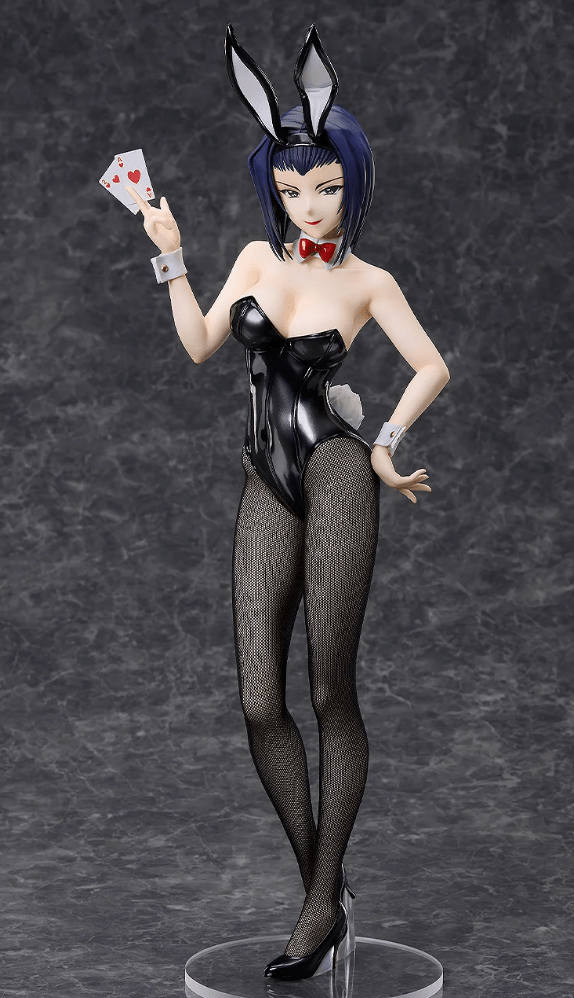 This version of Faye is a 1/4 scale figure. That means she’ll be over 18 inches tall (470mm). However, a portion of that is due to the black bunny ear headband she wears on her head. As she is dressed in a traditional bunny girl outfit, she has a black, shiny, one piece swimsuit on that has a white rabbit tail on the back. She has white cuffs on her wrists and a white collar fastened by a red bow around her neck. She holds the ace and two of hearts cards in her right hand. In addition to black high heels, the figure also wears actual fabric fishnet tights.