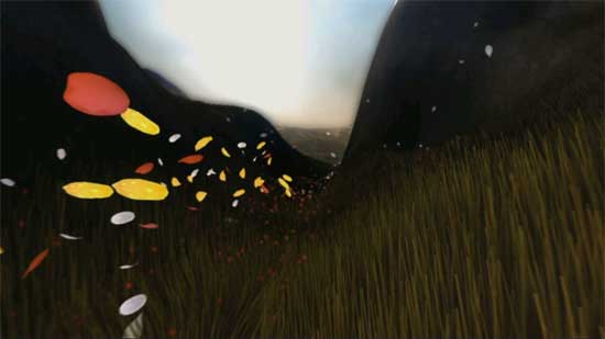 Flower begins in a dingy urban apartment with a single flower pot. You can sit and listen to the atmospheric noise or tilt the controller towards the flower to start the level. Once I zoomed in on the flower I entered the dream world where blades of grass dance to the wind. You play as the wind. I pressed a button to blow a gust of air and the first flower petal was airborne. The goal is hazy because it’s up to the player. You can gently guide the petal and, as Chen describes, “pet the grass.” He has seen young testers that love playing with the grass.