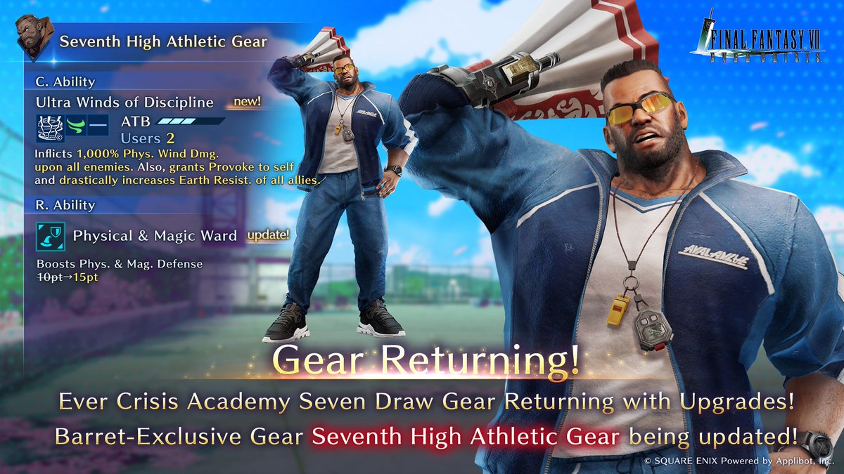 For April Fools’ Day 2025, Square Enix kicked off a Final Fantasy VII: Ever Crisis alternative universe storyline event, and now it confirmed that the FFVII Ever Crisis Academy Seven: Episode – Brawler AU is back again tonight. This also means the school uniform costumes for Aerith and Tifa and athletic gear teacher outfit for Barret will be updated with C Abilities for the first time. Everything shows up at 7pm PT/10pm ET on March 31, 2026. It’s unknown if there will be new content, like additional costumes or weapons for characters like Cloud, young Sephiroth, Angeal, or Zack or a second book that continues that storyline, as of time of writing.