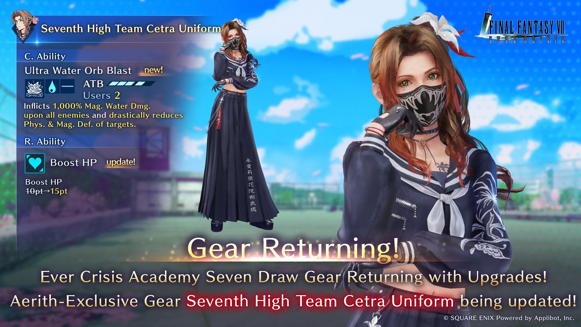 Final Fantasy VII Ever Crisis is available for PCs and mobile devices, and the FFVII Ever Crisis Academy Seven: Episode – Brawler AU and its Aerith, Barret, and Tifa school uniform and costume and weapon banners return on March 31, 2026.