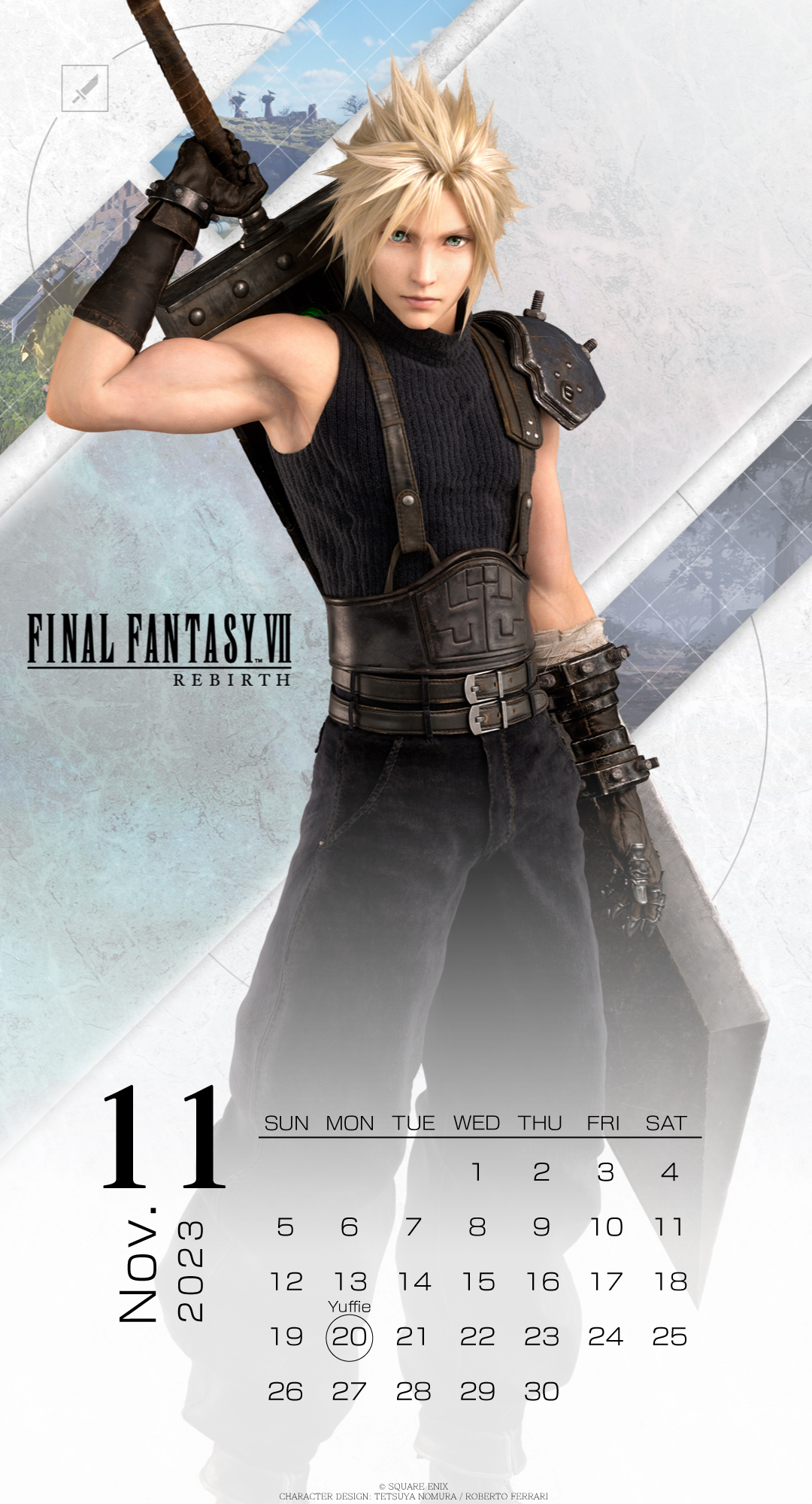 Here are the November 2023 FFVII Rebirth calendar images featuring Cloud and Barret: