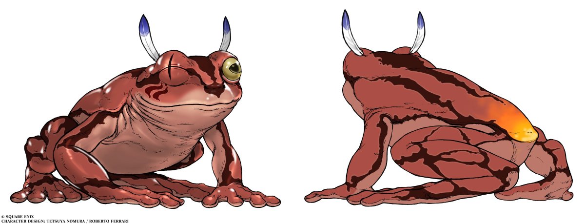 Here are the two pieces of FFVII Rebirth concept art of Cait Sith and Red XIII as frogs after being afflicted by a Toad spell or Frog Song.