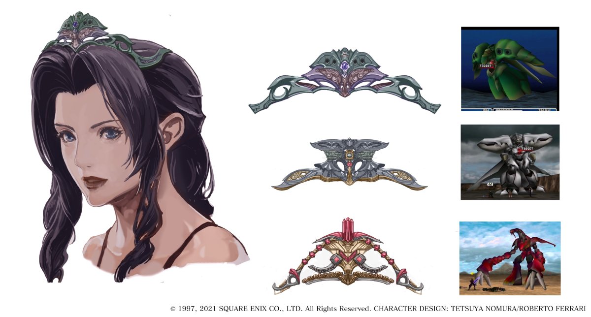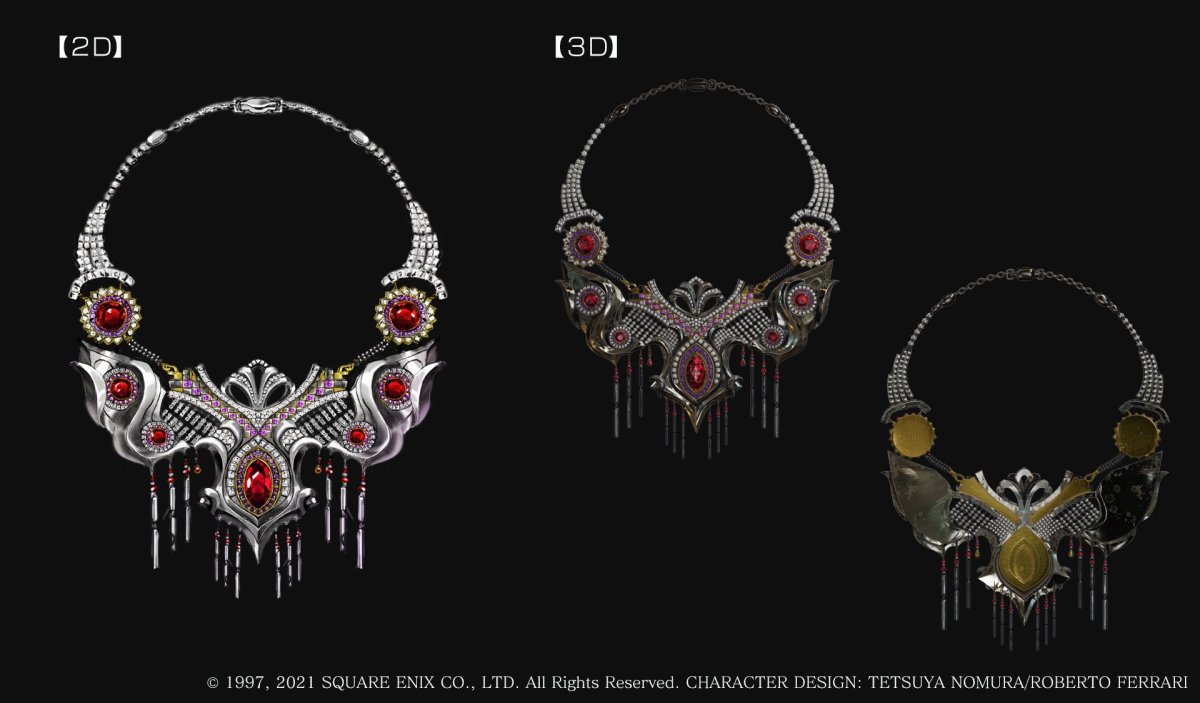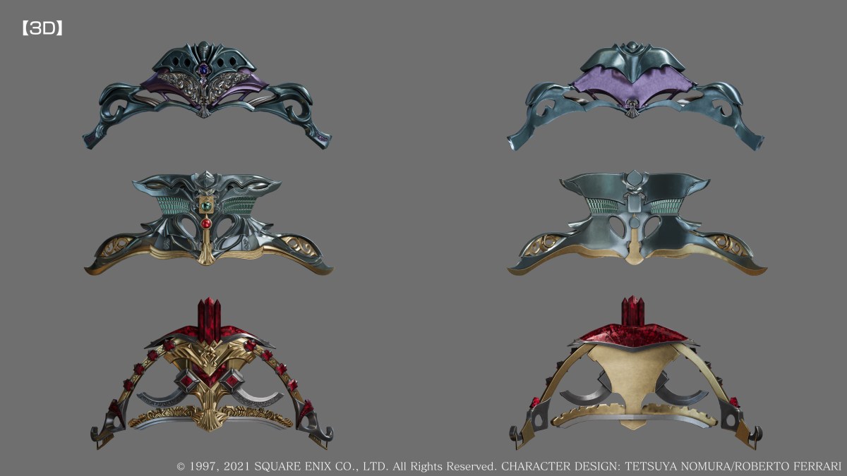 There’s new FFVII Remake concept art, and it looks at one of the game’s accessories and the Corneo’s Secret Stash tiara key items. With the tiaras, it shows how each one is inspired by original FFVII Weapon superbosses. As for the equipment, it takes a closer look at the FFVII Remake Götterdämmerung. First, here’s a look at the FFVII Remake Corneo’s Secret Stash tiara art. In addition to the designs, they compare each one to the classic FFVII Weapon superboss it is based on. In the initial image, Aerith is wearing the Emerald Tiara based on Emerald Weapon on the right. On the left side is 2D art of each tiara next to the weapon that inspired it. The Emerald Tiara is at the top, next to Emerald Weapon. The Diamond Tiara is in the middle, beside Diamond Weapon. At the bottom is the Ruby Tiara, which is to the adjacent to Ruby Weapon.