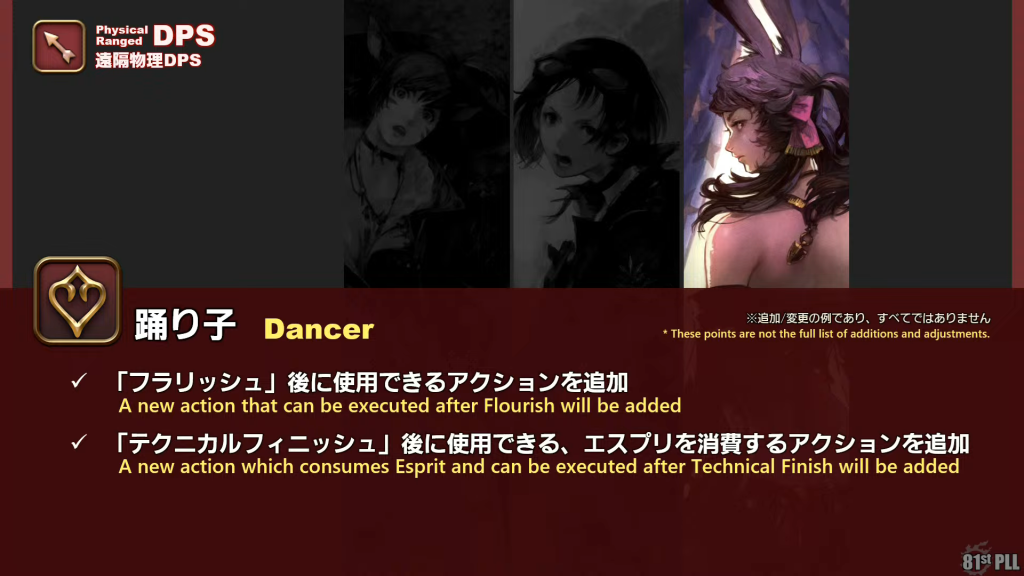 Dancer receives very straightforward changes, expanding on actions with the raised level cap and follow-up attacks. For example, a new action that can be executed after Flourish will be added. Another new action which consumes Esprit and can be executed after Technical Finish will also be added. There will also be an action that grants the effects of Standard Step without having to go through the step actions, as well.