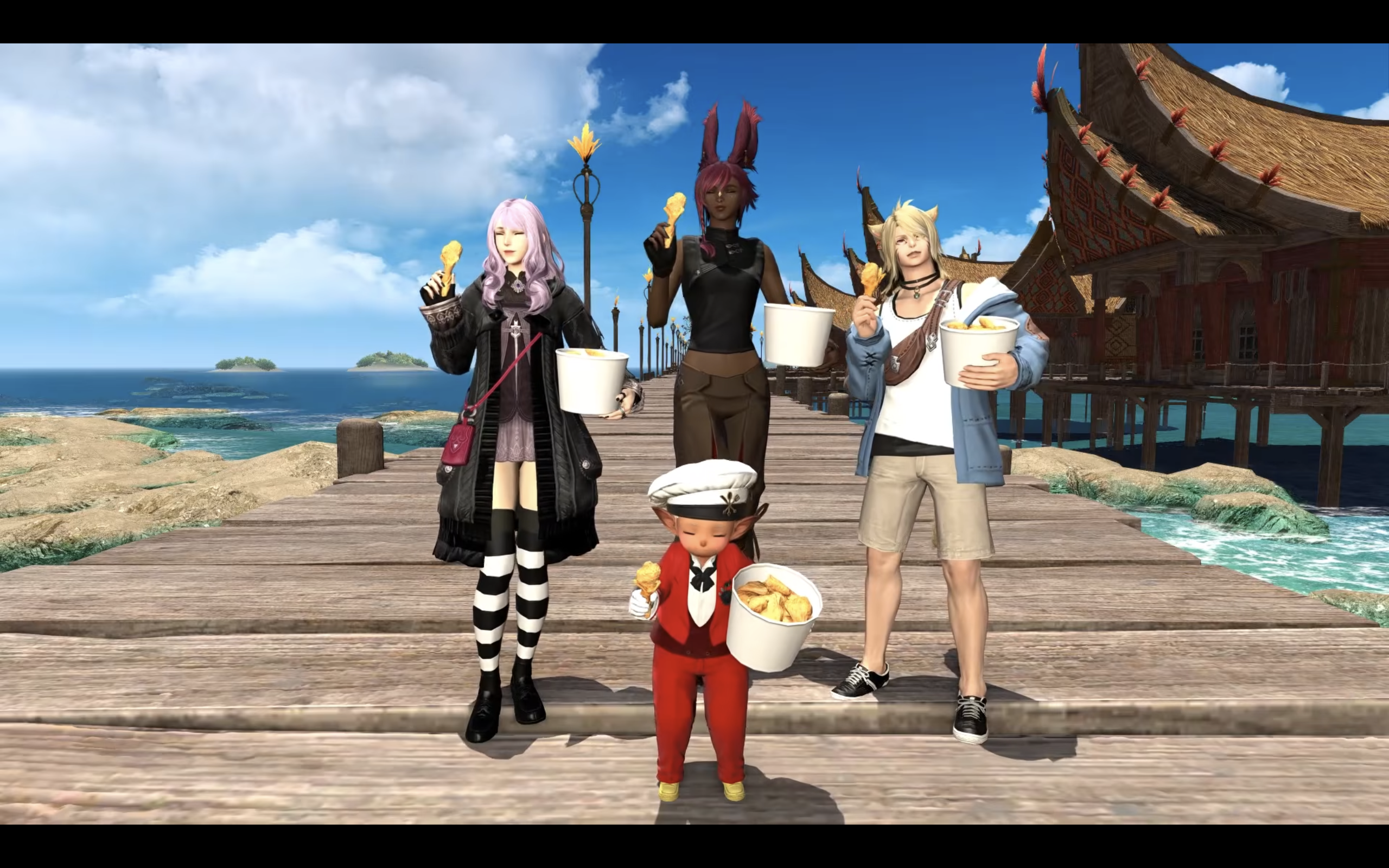 There will be two Jollibee FFXIV meals. The smaller one will be a box with a chicken sandwich, a regular size side like fries, a peach mango pie, a Chickenjoy piece, and a drink. If you’re in the US, that could be the Blue Raspberry Aether Crystal Boba drink, but in Canada the Lodestone mentioned a Pineapple Quencher. There is also a larger meal that could feed multiple people, with a six-piece bucket that comes with three drinks. Both feature special boxes and come with the Eat Chicken emote for FFXIV.