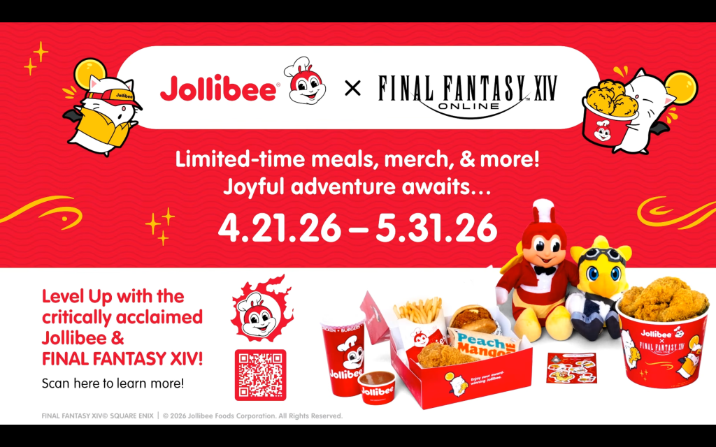 At the end of the Final Fantasy XIV Letter from the Producer Live Part XCII, Director and Producer Naoki Yoshida and Global Community Producer Toshio “Foxclon” Murouchi announced a FFXIV Jollibee crossover with merchandise, an emote, and special meals. It will kick off on April 21, 2026. In addition to being able to get some items from the restaurant, they confirmed Complex will sell the clothing tied to the collaboration. The meals and merchandise will come with a FFXIV Eat Chicken emote. The Lodestone also updated with additional details and confirmed this will appear in the US, with the Anaheim, California store decorated during Fan Festival 2026 between April 24-25, 2026.