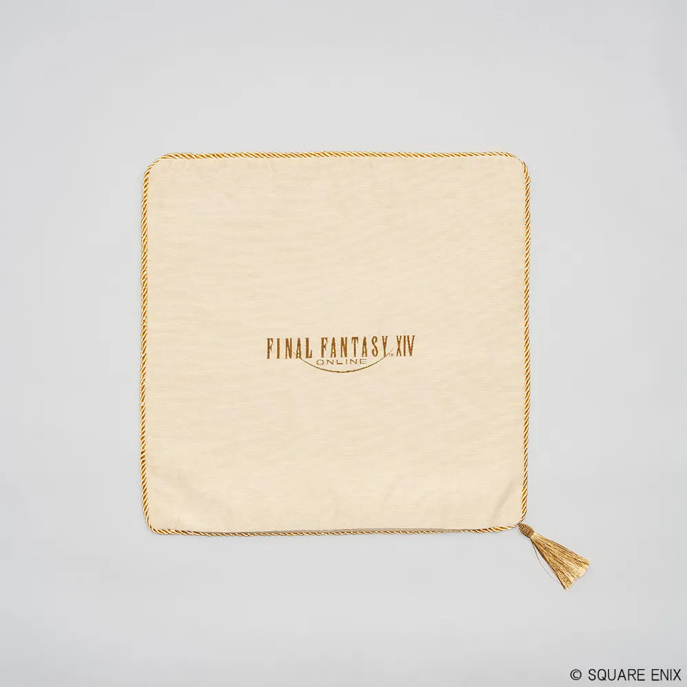 The cushion features a similar design. It is almost 18 inches long and 18 inches wide. You only get the cover and not an actual cushion inside of it. The front features the Gridanian design, and the back has the full Final Fantasy XIV logo.