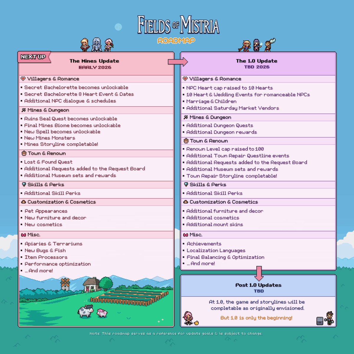 Fields of Mistria is in early access for PCs, the fourth major update appears on February 23, 2026, and the 1.0 launch is set for 2026.