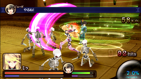 Namco Bandai’s next Tales spinoff is an action game that brings together 15 years of Tales in one PSP game. Tales of the Heroes: Twin Brave puts you in control of two characters from the mothership titles, but this is not a role playing game. This "escort" title is a Dynasty Warriors style beat ’em up with partner combos where you can team up and attack enemies.