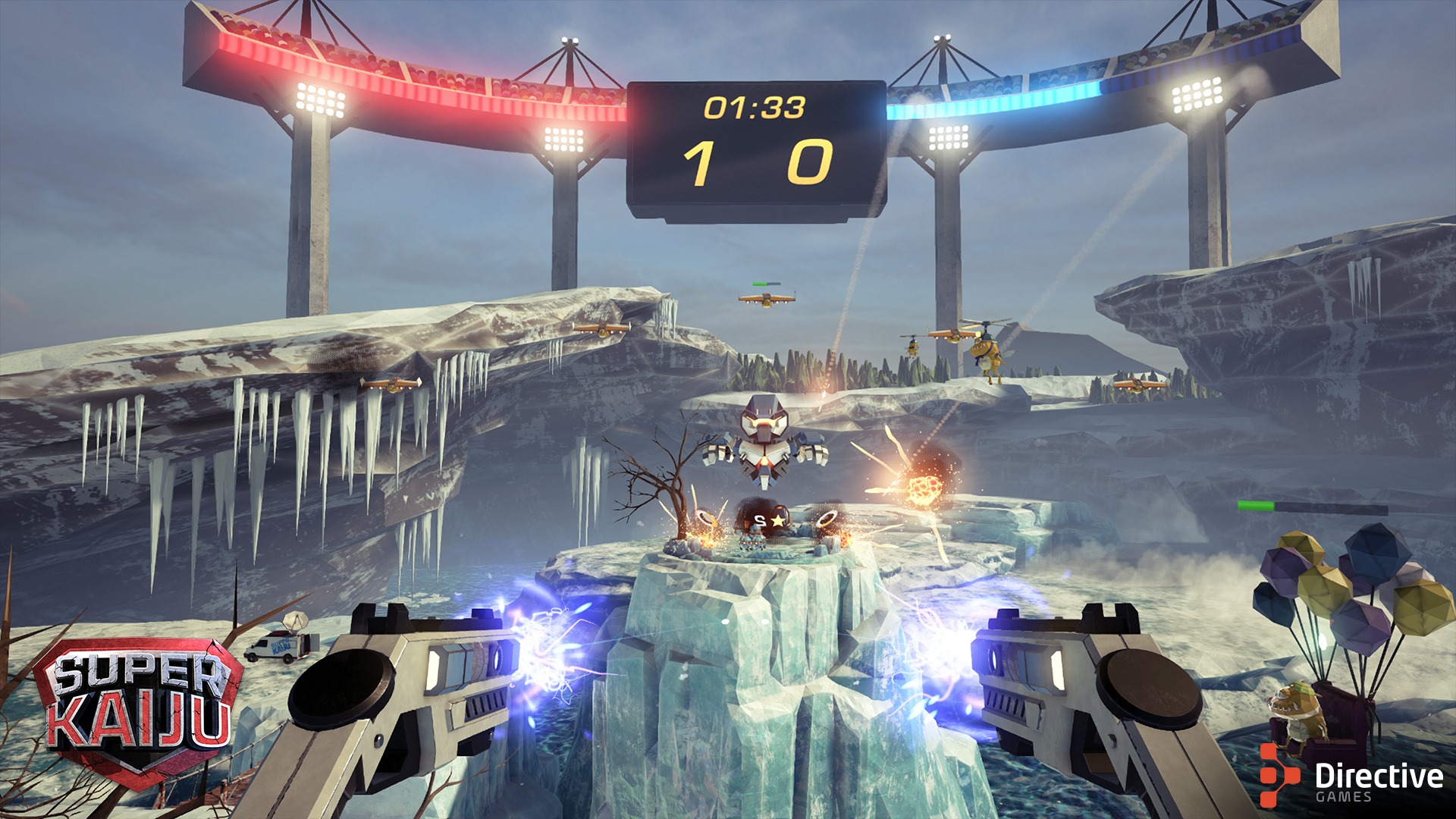 Super Kaiju has players controlling the weapons of their own Kaiju mech, using their guns to take out oncoming threats across varied landscapes. Should players manage to shoot down some of the other flying monsters assisting the enemy Kaiju, they can accrue stars that will let them launch missile strikes, or activate shields, on top of their regular attacks.
