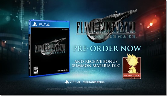 Additionally, all pre-orders come with a bonus Chocobo Chick Summon Materia DLC. Final Fantasy VII Remake releases for PlayStation 4 on March 3, 2020.