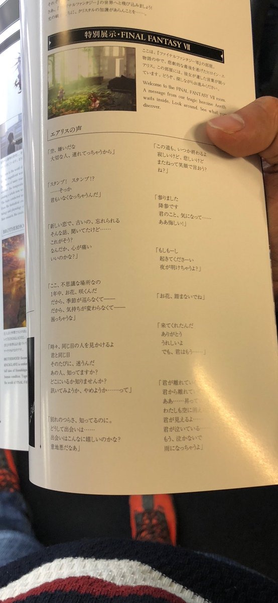 The exhibition has artwork from various Final Fantasy titles, with Final Fantasy VII having its special display called “Words Aerith Left Behind,” which is introduced by the following: