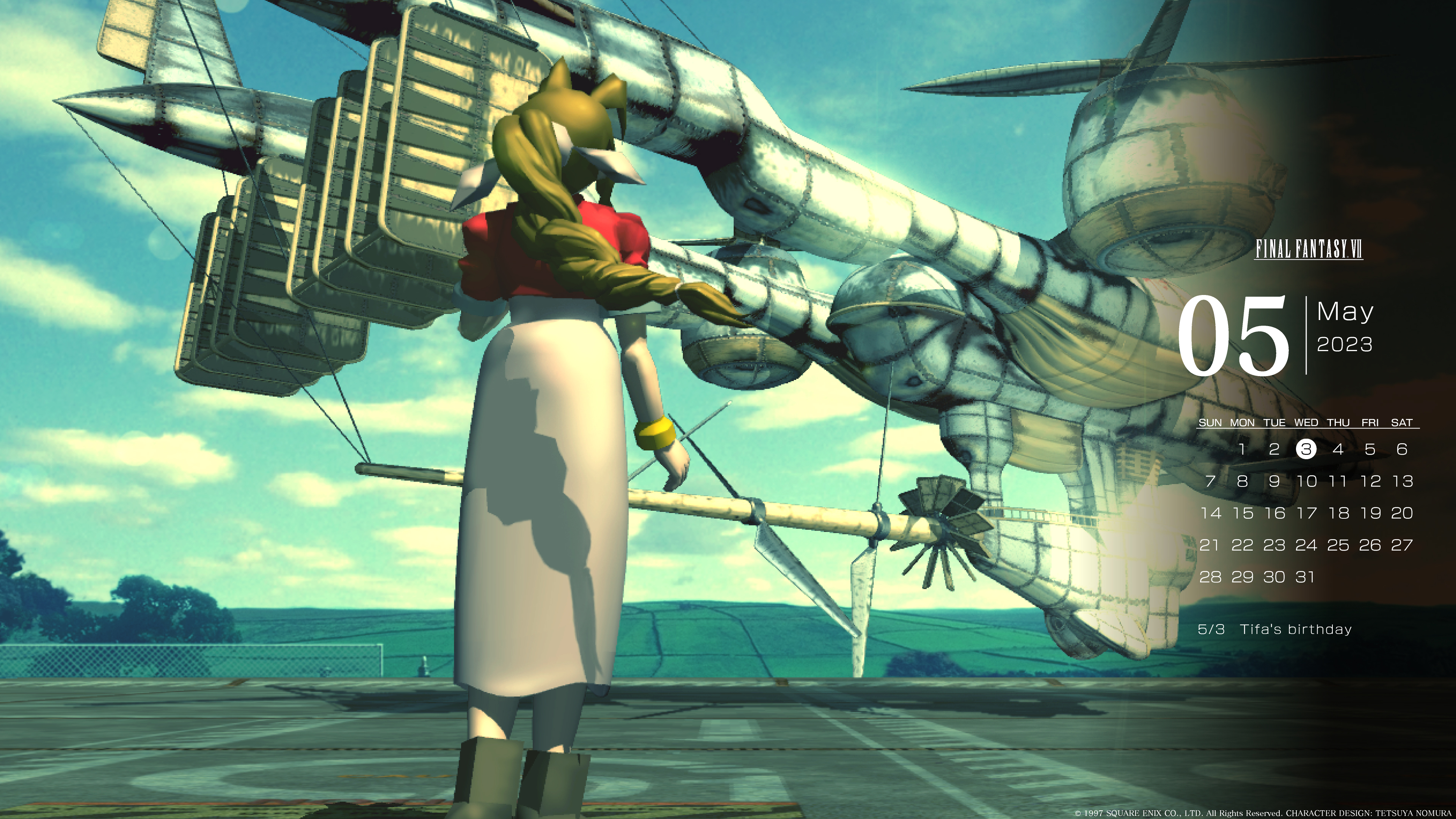 The May 2023 Final Fantasy VII Remake calendar is here, and this time Aerith key art is featured. However, as with past months in 2023, Square Enix shared multiple options. People can choose from two images with the classic key art of her in front of the Highwind airship from the original game. We could also use the two pieces from the remake with her in a similar pose in front of an empty platform. The two options can be used either on PCs or mobile devices. All four options remind people that Tifa’s birthday is on May 3, 2023. First, here are the two May 2023 Final Fantasy VII calendar options featuring the original Aerith art.