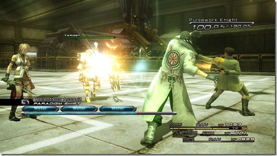 Almost all of the enemies in Final Fantasy XIII are visible. You can run past robots, if you want, but it’s better to sneak up on them. Catch an enemy off guard you start the fight with a preemptive strike. That makes Lighting or whoever the leader is hit all enemies and put them close to break status. Notice the meter underneath “Pulsework Knight?” That’s the boost meter. Each fire spell, gunshot, and boomerang to the noggin increases it and the amount of damage you do. Fill the meter up to send that enemy into break status, which dramatically increases the amount of damage you deal. It’s a good idea to focus all of your attacks on a single foe to charge the boost meter. It bumps up a bit with each blow, but falls rapidly if you aren’t putting pressure on the enemy. Since Lightning or Sazh act on their own, you have to time Snow’s attacks in between theirs to keep the boost meter going.