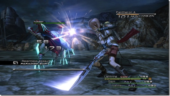 In the very beginning, Lightning can attack and use a wide circular slash. Snow has his fists and hand grenades. Both characters, if you get the timing right, can hit a group with their secondary attacks. That isn’t always easy because enemies, like PSI-COM units and Pantherons, move on their own. Lighting runs around the screen too, even though you can’t tell her where go. During battles everything is in motion, but you still control the action via menus. Attacks take up a different amounts of ATB gauge. A basic attack or spells like Ruin or Thunder use one one bar. Radial Strike and enhancers like Faith consume two. Lightning quickly gets three ATB bars so you can make her do a three hit sword combo, Radial Strike then Ruin or slash –> Ruin –> slash. Whatever you can fit into three bars is OK. You don’t have to wait for her ATB gauge to fully fill up either. As long as you have one bar filled you can attack. Perhaps, the new ATB interface is like a flashy version of Chrono Cross or a revision of Dissidia’s menu battle mode.