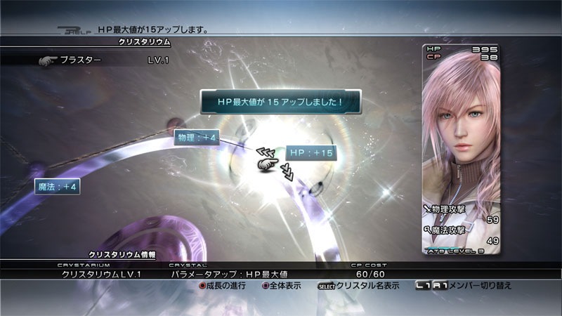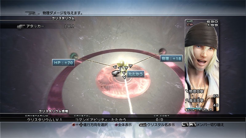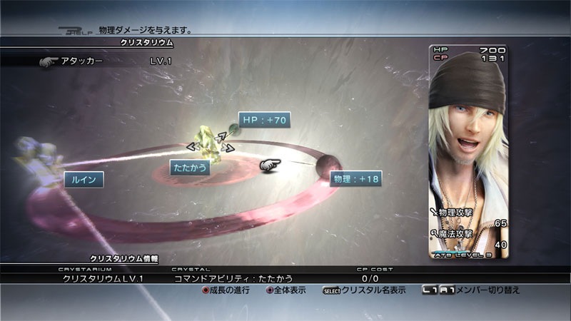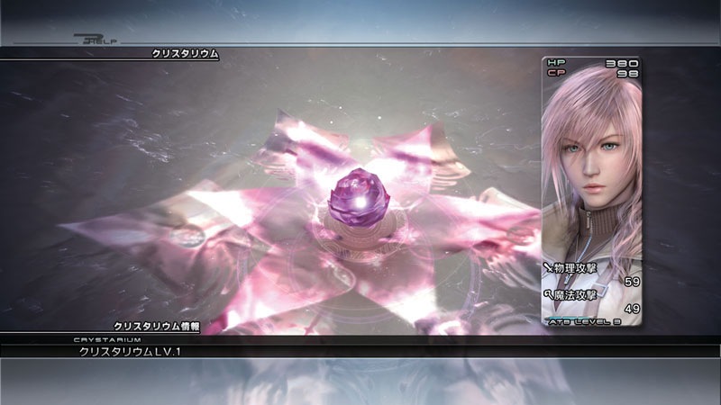 Final Fantasy XIII is too modern for “levels”. It has a Final Fantasy X style character growth system where players spend Crystarium points to purchase abilities and stat boosts earned from encounters. As seen above, Lighting is playing the role of a blaster and can purchase HP +15 or the magic spell thunder. Snow, being an attacker, has different options like the ruin spell and HP +70.