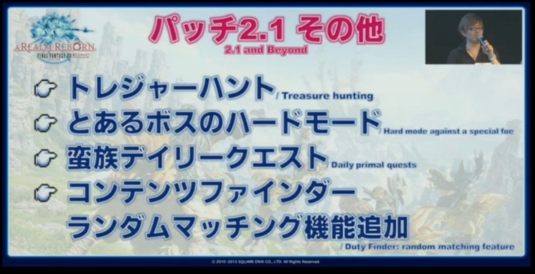 During a special Final Fantasy XIV: A Realm Reborn stage at Tokyo Game Show, producer/director Naoki Yoshida provided a peek at what to expect from the anticipated version 2.1 update, where we’ll be seeing new dungeons, personal housing, player vs. player and more. Here’s a look at some of the key features.   2013-09-20_213832 In version 2.1, we’ll be seeing a several new dungeons. This one in particular is called the Crystal Tower, which is based off the same area from Final Fantasy III. This dungeon will require 24 players to take on. According to Yoshida, it won’t be too tough to the point where one or a few players falling means the end of the run.   The next update will also introduce the Player Housing system, which will be available at all three city-states in Eorzea. There will be about 380 different parts to decorate your own home.   Additionally, we’ll also be getting a new PvP arena feature, called The Wolve’s’ Den. The player vs. player system will pit two teams of four players up against each other. This feature will be further demonstrated tomorrow.   2013-09-20_214017 Here’s a look at some extra content we’ll also be seeing in the patch: