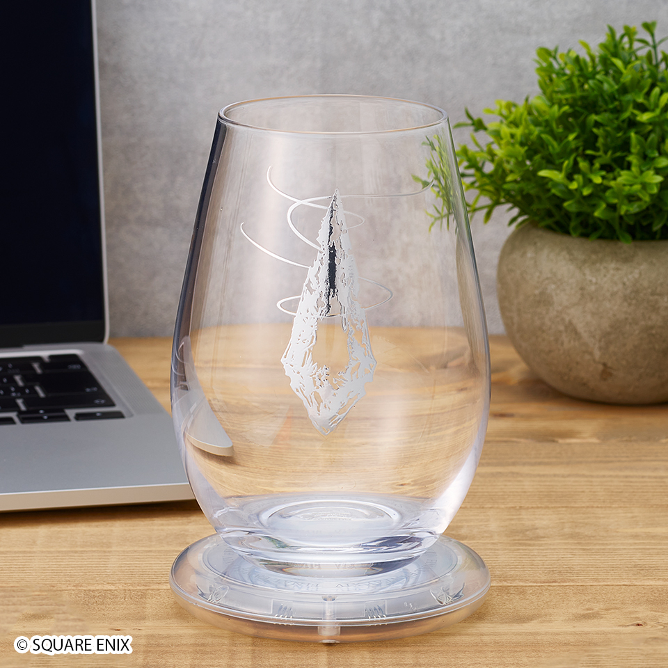 There are two versions available of the LED coaster and glass set, a regular and a limited edition. The regular edition includes a single LED coaster and glass. The coaster has blue LED lights and the Final Fantasy XIV name engraved around it, while the glass features a foil-printed silver rendition of the Mothercrystal.