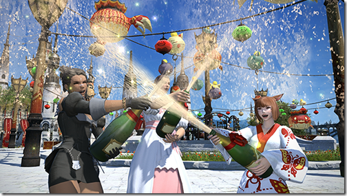 There are also a few usable items to further celebrate the event, like fireworks champagne bottles that can be used to go around spraying, and two minions in the Wind-up Minfilia and Wind-up Thancred that can be purchased through an NPC at Limsa Lominsa.
