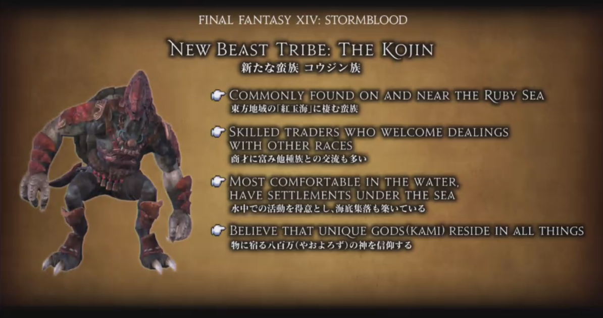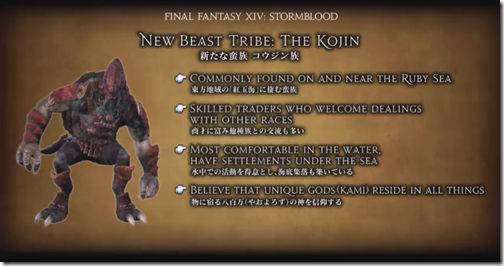 A new beast tribe was revealed to be the Kojin, a race of skilled traders who live on or near the Ruby Sea. This beast tribe worships the primal Susano, Lord of the Revel, above all else. Susano is the second original primal made for Final Fantasy XIV, after Ravana.