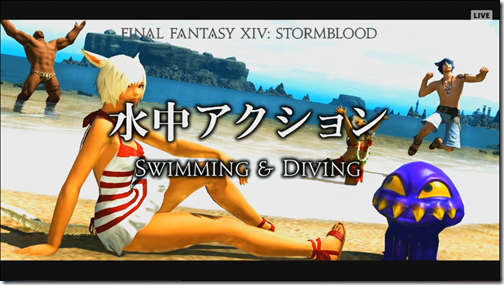 Stormblood will also introduce the ability to swim and dive in certain areas. Upon entering an accessible body of water, you character will automatically switch to swim mode. In swim mode, your default walking speed turns into a breaststroke animation, while using sprint will cause your character to crawl. No combat will be available while swimming, and there will be no loading times when switching to swim mode. c2ee451c020e1e7c8690198125215ecf