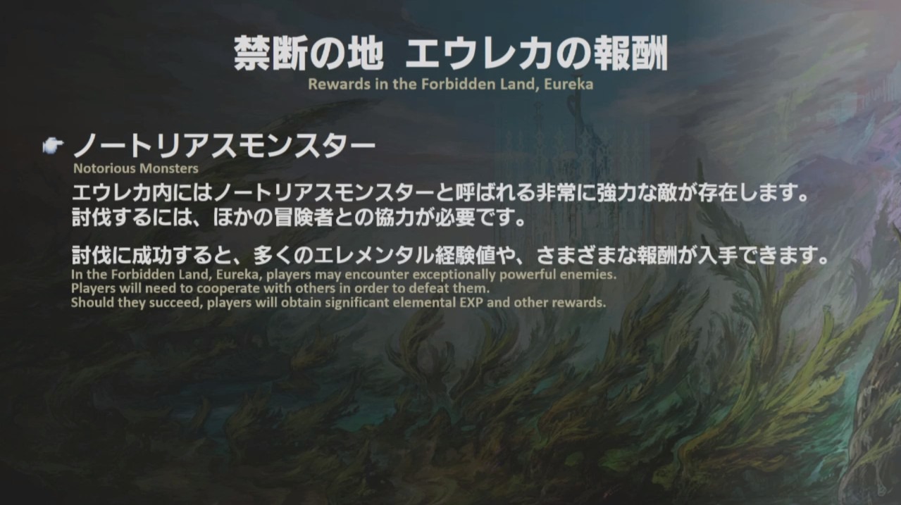 - In the Forbidden Land, Eureka, players may encounter exceptionally powerful enemies. Players will need to cooperate with others in order to defeat them. Should they succeed, players will obtain significant elemental EXP and other rewards.