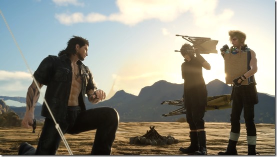 When you get into Final Fantasy XV, it’s initially all about rambling around and enjoying the world. You have a huge area to explore. There are collection spots, ready to offer you minerals, food, and treasure. There are photo ops, where you can make memories with these virtual friends. You can take time to camp out or rest, going through photos or enjoying a meal. There’s this initial sense of freedom as you go from city to city and objective to objective, yet still have time to take a break and hop out to explore something that seems interesting or suspicious. It might not feel exactly like previous Final Fantasy games, what with open-world elements that feel plucked from Bethesda games, but it definitely relies heaving on its road trip theme and runs with it.