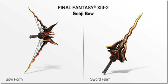 If you reserve Final Fantasy XIII-2 at Gamestop you can get a costume and weapon for Serah. The costume (which still hasn’t been revealed) is for everyone. The Genji Bow is only for PowerUp Rewards members.
