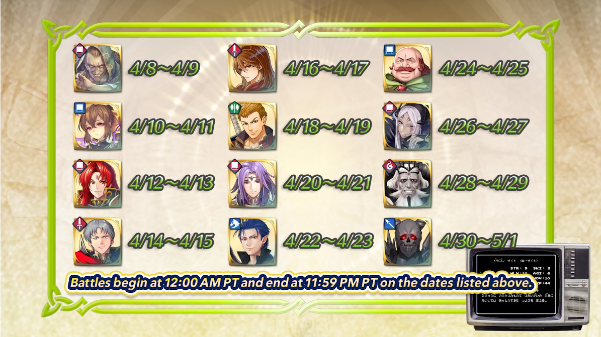 One Grand Hero Battle originating from each game in the series is returning for two days each, beginning on April 8, 2020 and ending on May 1, 2020. Additionally, easier Reward Maps will be available over 13 days representing each of the games, including Tokyo Mirage Sessions #FE. Finally, players can summon for one random five-star main protagonist from different installments as part of the ‘Fire Emblem Leads’ banner. The summoning will be randomized.