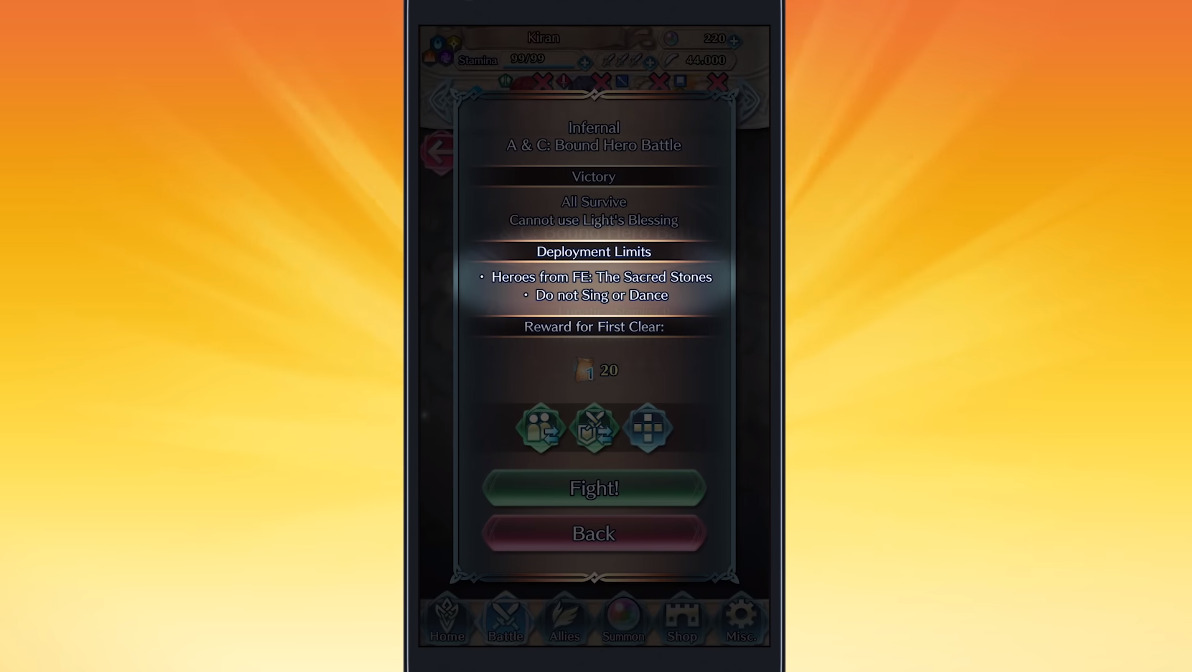 The next update for the game will include new versions of past special maps, but will include conditions to spice up the challenge. For example, it might only allow players to use characters from a certain game in the series and might restrict players from adding a Dance/Sing unit or other similar assists to their team for the map. The first Limited Hero Battle will begin on April 13, 2020, with more added day by day until April 17. It will end completely on April 19, 2020. Players will be able to obtain 5,000 Hero Feathers and 220 Divine Codes (used for the Compile Manual feature) from the first wave of Limited Hero Maps. Filter