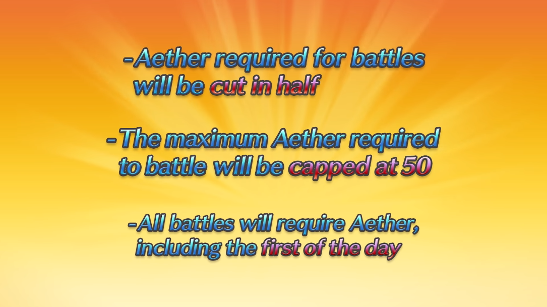Some changes are coming to Aether Raids, due to feedback from players. The Aether needed for battles will be halved, and capped to 50 at most. However, the free Aether Raid battle per day that doesn’t cost Aether will be scrapped.