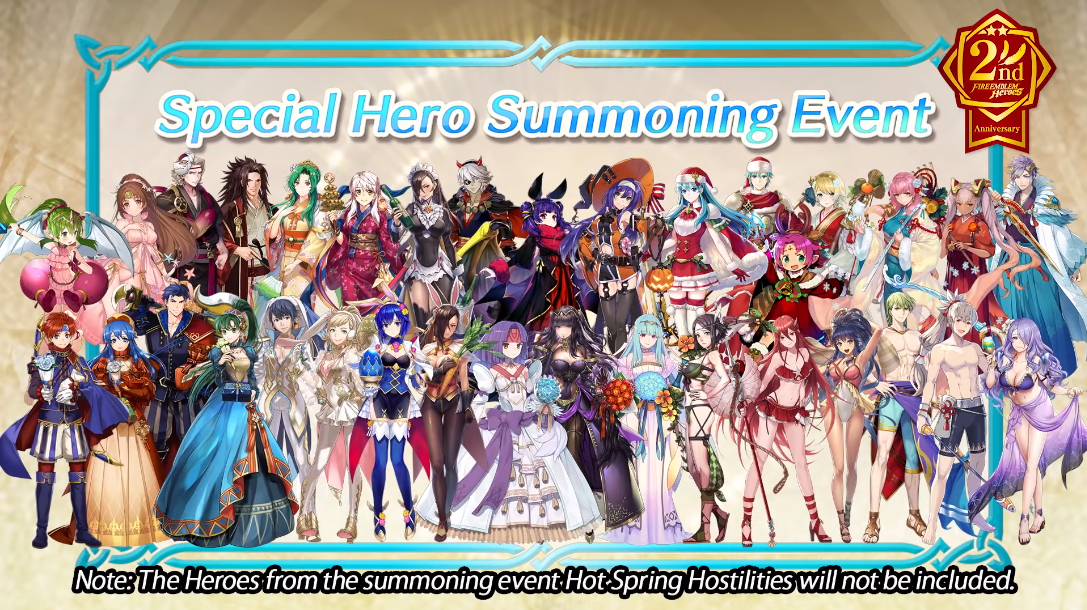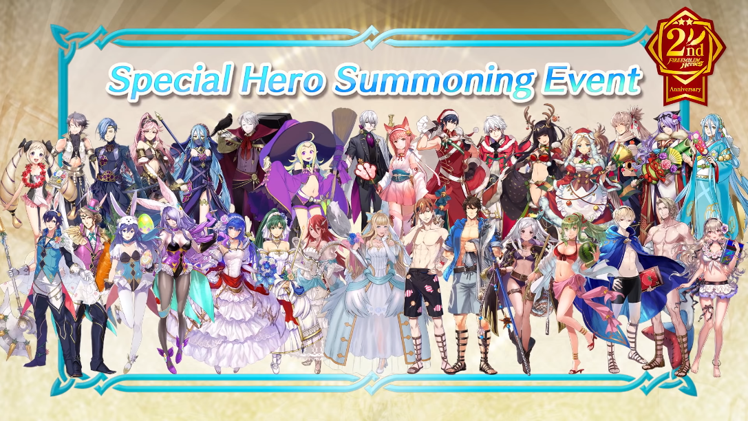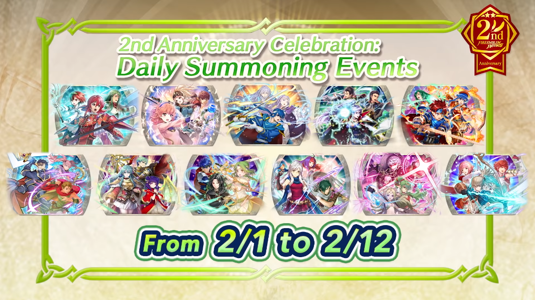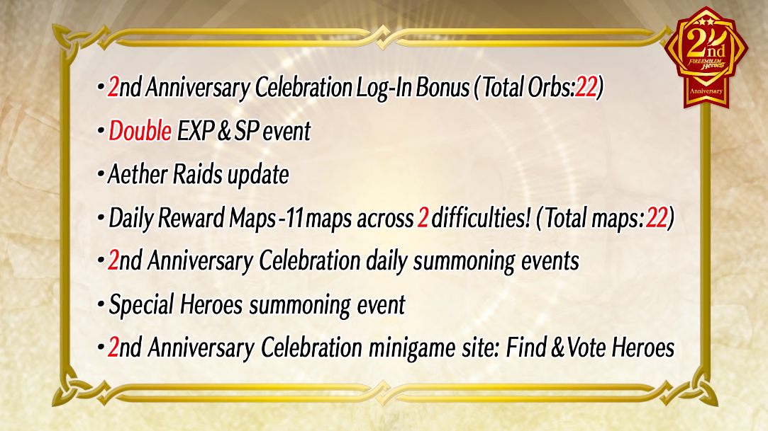 The theme this time is the number 2, based off the 2nd anniversary. Apart from the Log-In Bonus, Double EXP & SP, and Daily Reward Maps that were also present during the first anniversary, this time there are daily summoning events and Special Heroes summoning events that Feh Channel elaborated upon.