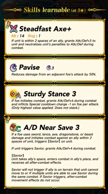 Dedue backs up the Blue Lions representation as Dimitri’s Vassal, a green armored axe unit. His character art came from Kita Senri and his English voice from Ben Lepley: