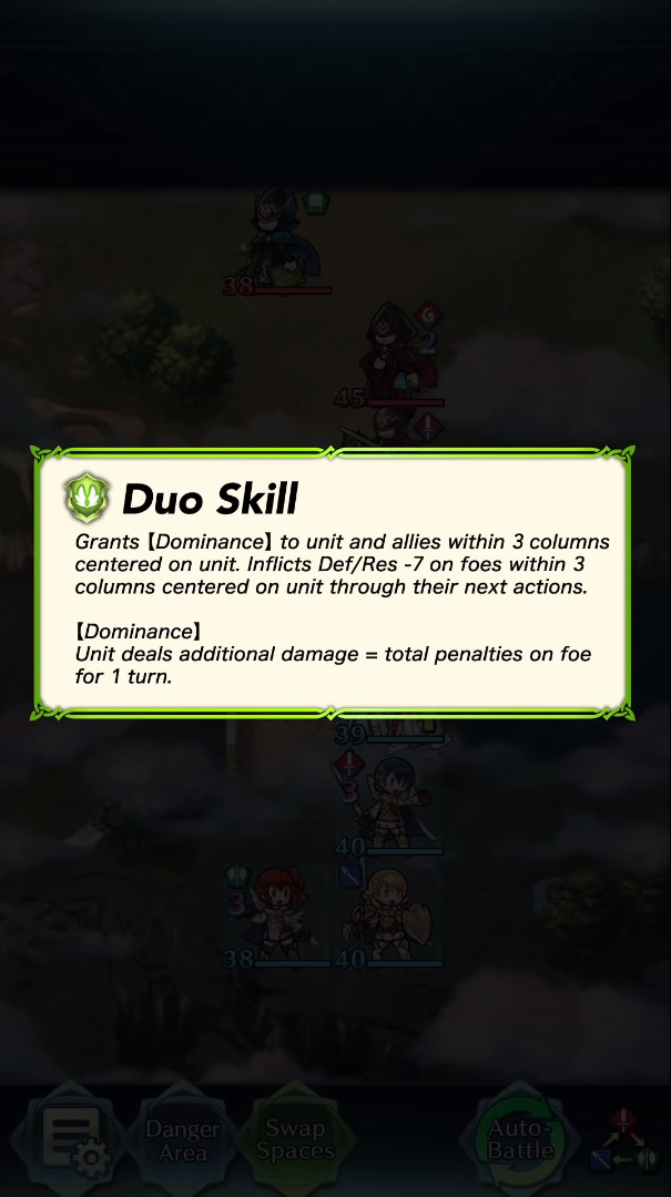 Fire Emblem Heroes Duo Hero, Micaiah and Sothe have the ability to inflict the ‘Dominance’ effect once per map (twice if in Aether Raids with Duo’s Indulgence structure). This allows players to deal additional extra damage on opponents based on their total stat penalties.