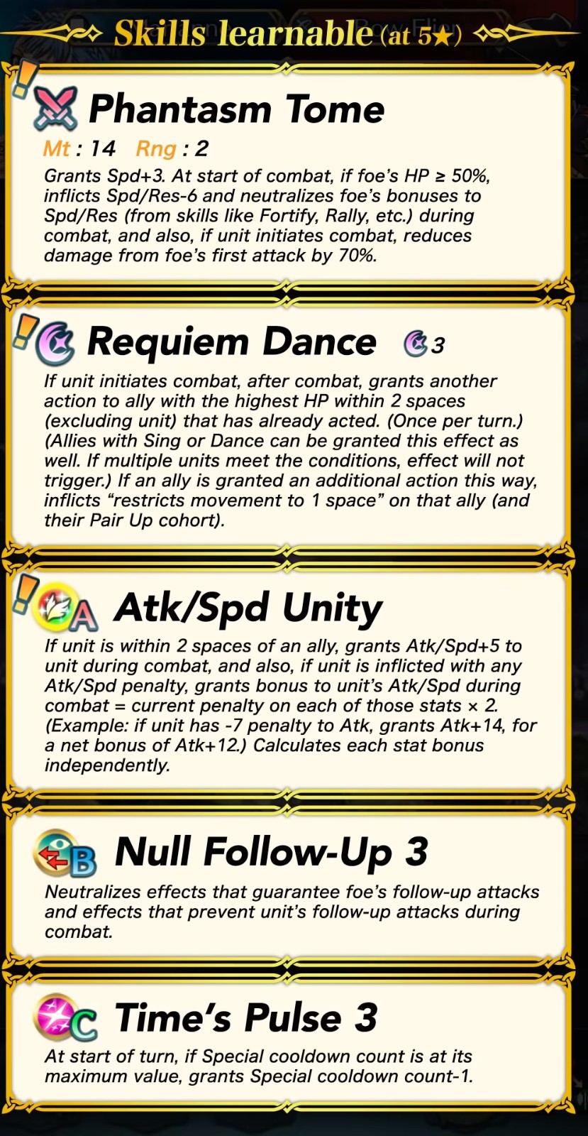 The CYL Marianne in Fire Emblem Heroes is a “dancer” who doesn’t have a Dance assist skill. Rather, her Requiem Dance special handles it. She wields the Phantasm Tome and has the Atk/Spd Unity, Null Follow-Up 3, and Time’s Pulse 3 skills.