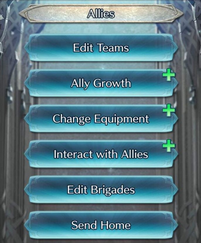 The Allies menu will undergo a streamlining that will put several options under new submenus. Ally Growth will contain the Level Up and Learn Skills features; Change Equipment will have Skill Changing, Sacred Seal Changing, and Accessories inside; Interact with Allies will have the Ally Support and Summoner Support options.