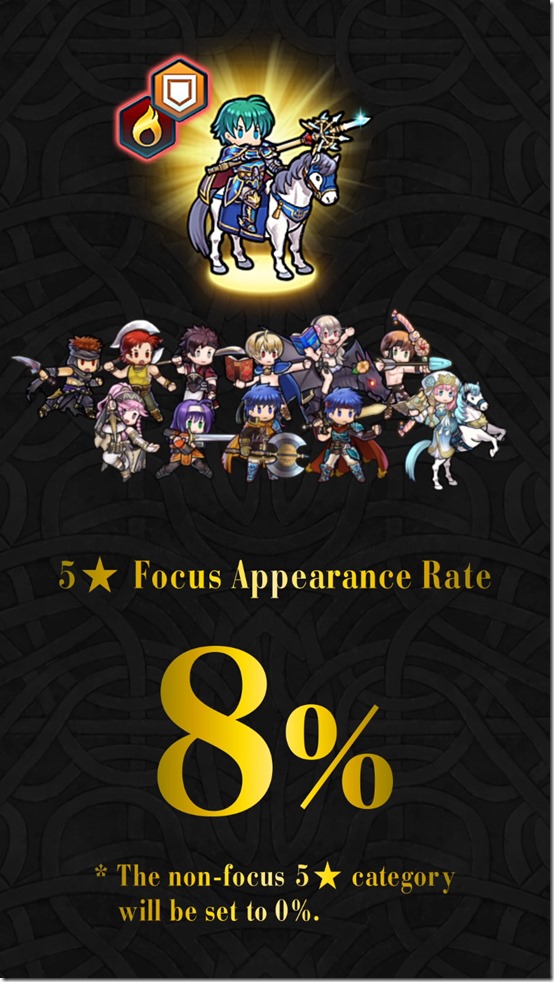 Since it’s a Legendary Summoning Event, the Focus will include several other Heroes with a generous 8% appearance rate on top of a guarantee of non-focus 5-star Heroes being set at a 0% appearance rate.