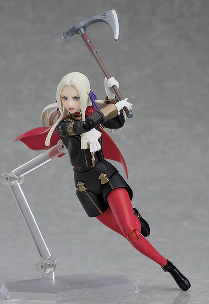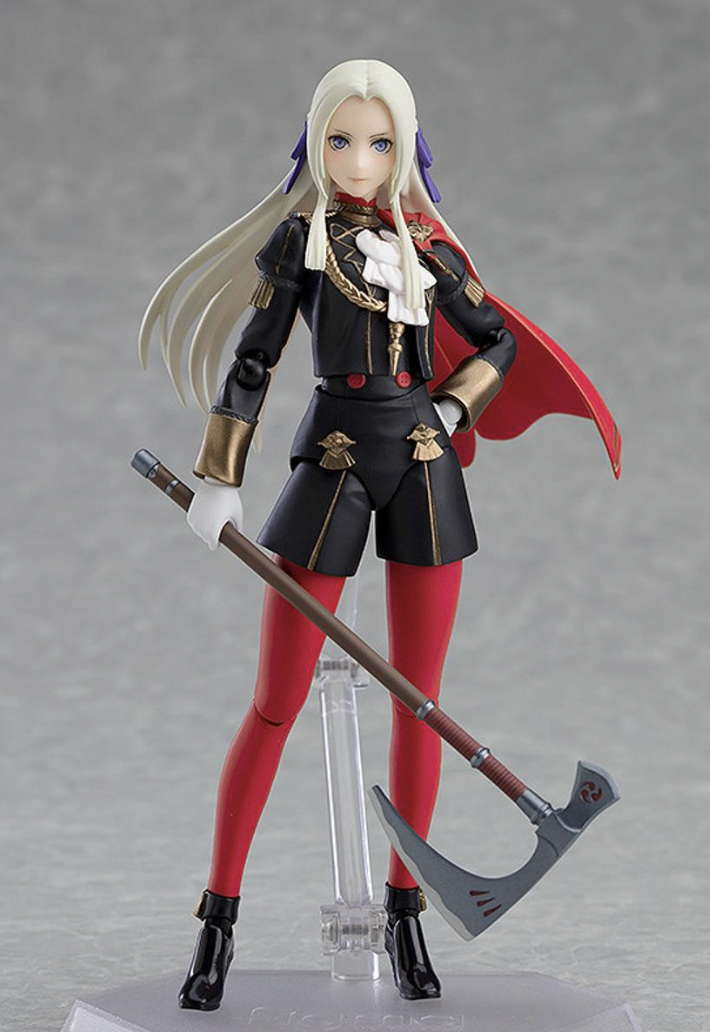 As with the original release, the Edelgard figma is based on her appearance in the first half of Fire Emblem: Three Houses, and the figure wears her Black Eagles school uniform. Her face plates allow her to be depicted either smiling or letting out an angry yell. She comes with two weapons she can equip. One is the generic Killer Axe. The other is her Crest Stone axe Aymr.