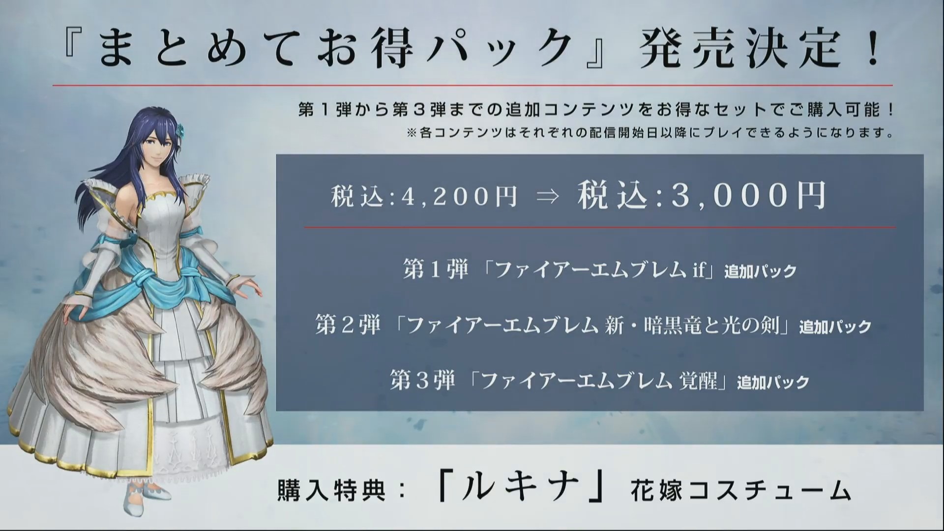 The first DLC expansion pack is for Fire Emblem Fates and it’ll release within the year. The second one is based on Fire Emblem: Shadow Dragon and it’ll release sometime after New Year’s in Winter 2018, and the third one based on Fire Emblem Awakening will release in Spring 2018. The DLC expansion packs will be available for 1,400 each and each one includes its own new playable character. There will also be a season pass with all three expansion packs for 3,000 yen plus a bonus bride costume for Lucina. Fire Emblem Warriors launches on Nintendo Switch and New Nintendo 3DS in Japan on September 28, and October 20, 2017 in the West.