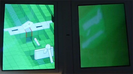 Assembly Line is the introductory game in the Rhythm Heaven. You hold the DS in “book mode” and swipe the stylus forward on the touch screen to fling a rod. Two squares rotate towards the conveyor belt below while tones play do-re-mi in the background. You want to send the rod flying on so, the fourth note. In typical Rhythm Tengoku style the tempo often changes to keep players on their toes. Once you get a good feel for the game your vision is limited to a peep hole, which forces players to rely on the audio cues.