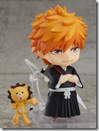 The Ichigo Kurosaki Nendoroid has him in his Shinigai uniform. Two leg parts are included, so he can be standing normally or posed in a fighting stance. He has three face plates: shocked, smug, and yelling. There are two versions of Zangetsu included, so you can pose him with the sword wrapped on his back or unwrapped for him to wield. Kon as also available, so he can have a buddy with him.