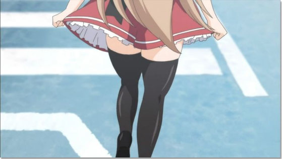“It’s not like I was waiting for you!” Serizawa exclaims, indignantly, in typical tsundere fashion, as Takumi exits his house for school, finding her leaning against a lamppost, in wait for him. As they walk to school together, the camera zooms in behind her ass for a good several seconds (as depicted in the fine screenshot above), teasing another glimpse of her panties but never quite giving it to you. Then, as she continues to stroll at a leisurely pace, it cuts to her front for an upskirt shot, but still no panties. Oh, you cunning devils!