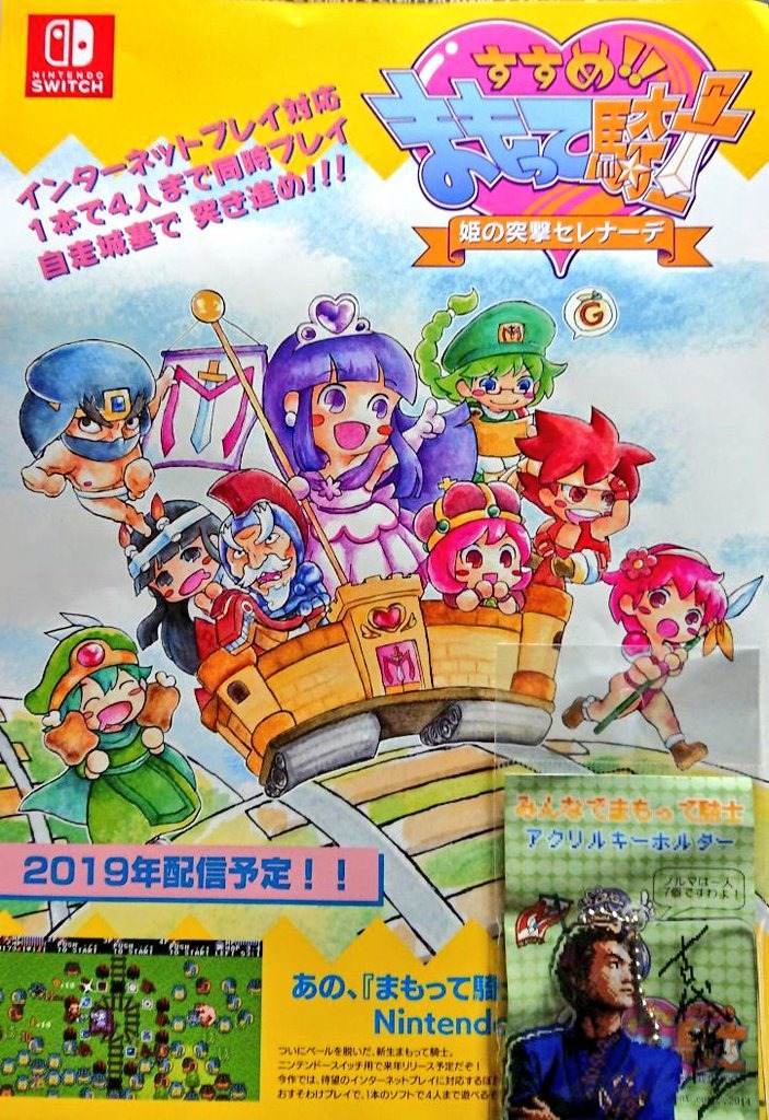 The next game in the Protect Me Knight/Gotta Protectors series, Susume!! Mamotte Knight was shown off with a demo today at the New Japan BGM Philharmonic Orchestra Yuzo Koshiro concert, and flyers provided during the event has revealed new details about the upcoming Switch title. [Thanks, @Alisia_DRG on Twitter!] For the first time in the series, online play will be supported. You can also play locally with up to three other people, with the split Joy-Con control scheme being supported.