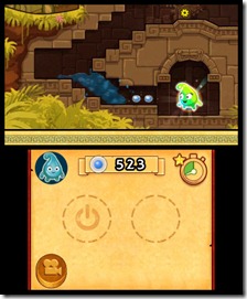 It sounds odd, but the way Fluidity: Spin Cycle controls was my favourite part of the game. Controlling a body of water doesn’t feel like any other game I’ve ever played. You aren’t controlling a single character, you’re literally controlling a mass of water that actually acts like water. It splashes around, it breaks up into smaller droplets that can go all over the place, it flows faster or slower depending on the way you tilt your 3DS, and once you get good at it, you can do all sorts of little fun things. For example, you can tilt your 3DS to let part of the water drip off the edge of a platform, and then tilt back to prevent the rest of it from dripping off as well. Now, you’re simultaneously controlling two water bodies in separate locations. Sometimes, I would just splash around all over the place because watching the way the water body behaves and reacts is pretty fascinating. There’s a very natural desire to experiment from the very moment you begin playing Fluidity: Spin Cycle, and the water body reacts exactly the way you would expect. You don’t just control water either. Like in the original Fluidity, you’ll come across the ability to turn into ice and cloud forms as well. These, too, behave just like you would expect. For example, the block of ice can be very slippery and it takes a bit to get used to how it handles. It’s unfortunate that Nintendo didn’t release a demo for the game to show the concept and physics system off.