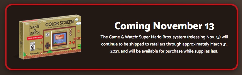 There’s an update on Game & Watch Super Mario availability in North America. The official website has updated with a message that might reassure people hoping to grab the replica of Nintendo’s original gaming handhelds. It now notes the system will not only launch on November 13, 2020, but “will continue to be shipped to retailers through approximately March 31, 2021.” [Thanks, Camo_Magic on Reddit!]