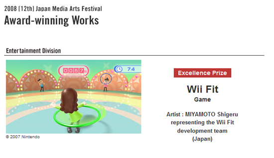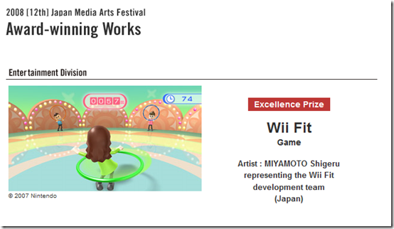Wii Fit with an Excellence Prize! The Grand Prize went to a light up musical instrument called Tenori-On. In addition to a trophy the excellence prize comes with 300,000 yen ($3200) which is like chump change to Nintendo.